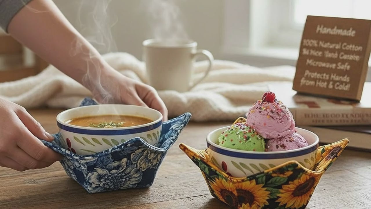 Enjoy your favorite soups, stews, or ice cream in comfort and style with our handcrafted 10-inch bowl cozy! Each cozy is made from 100% natural cotton fabric, cotton batting, and cotton thread, ensuring it’s completely microwave safe — no synthetics, no worries.